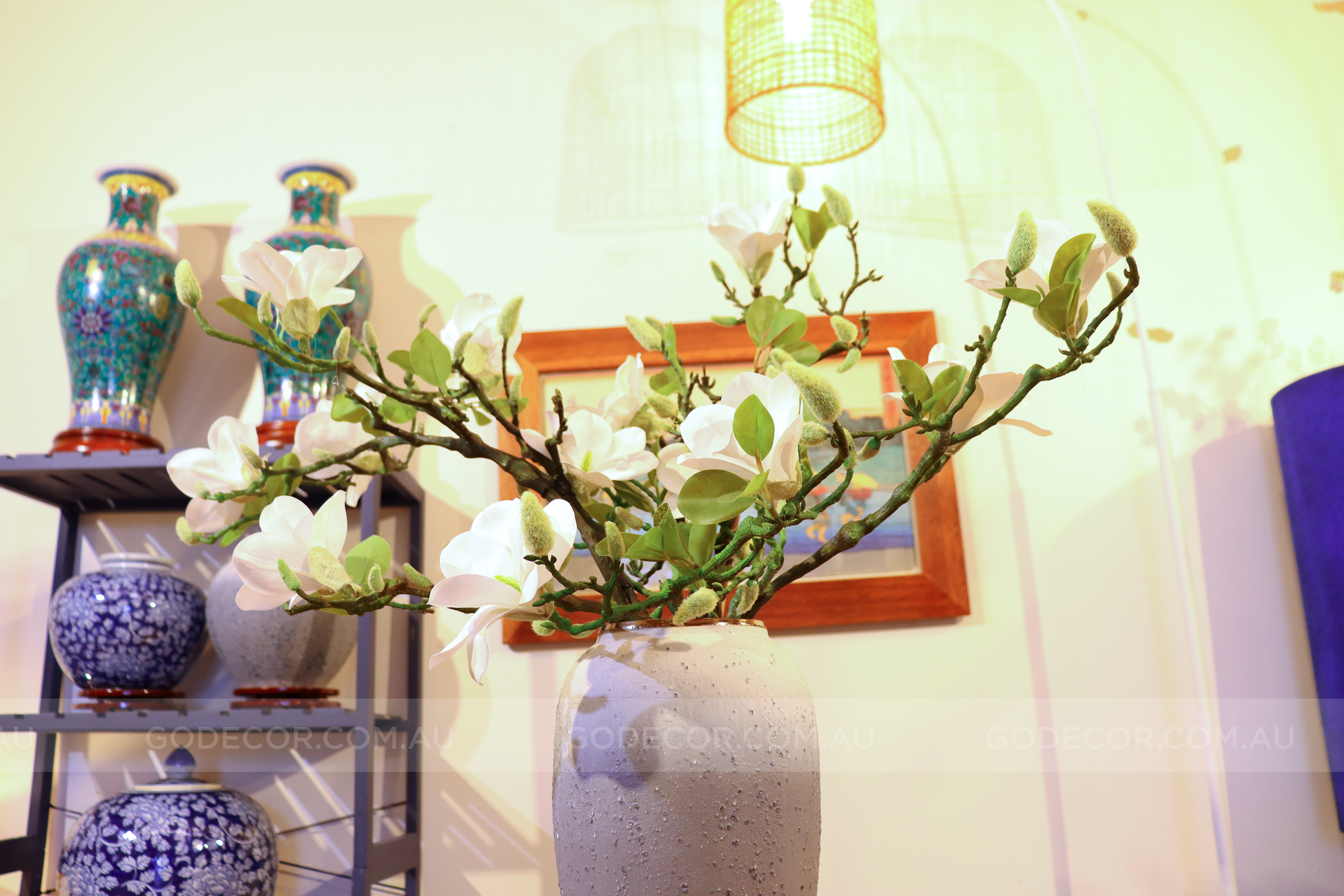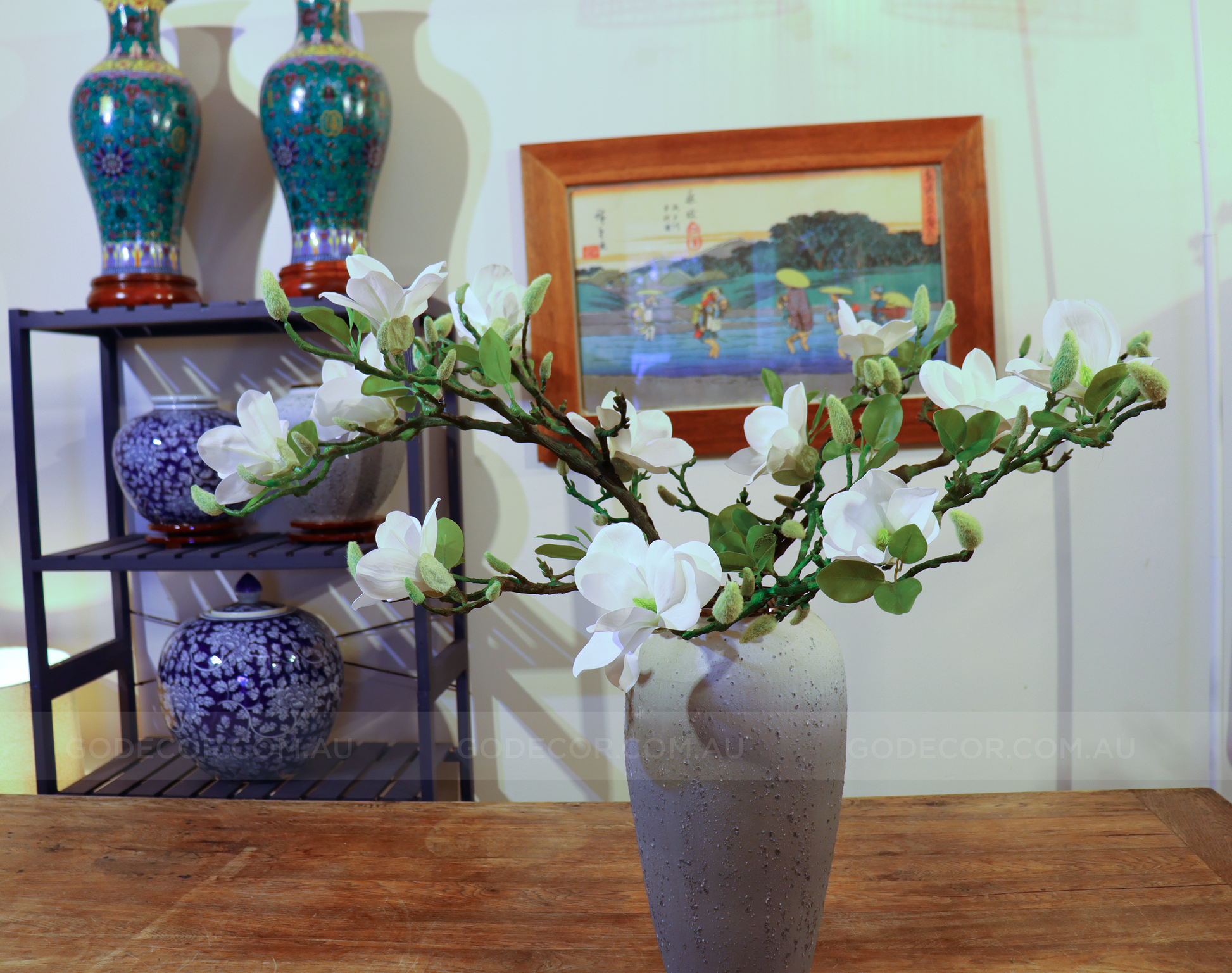 This arrangement included : 07 large branches of magnolia, 01 vase. Anything else in the pictures just for decorating.